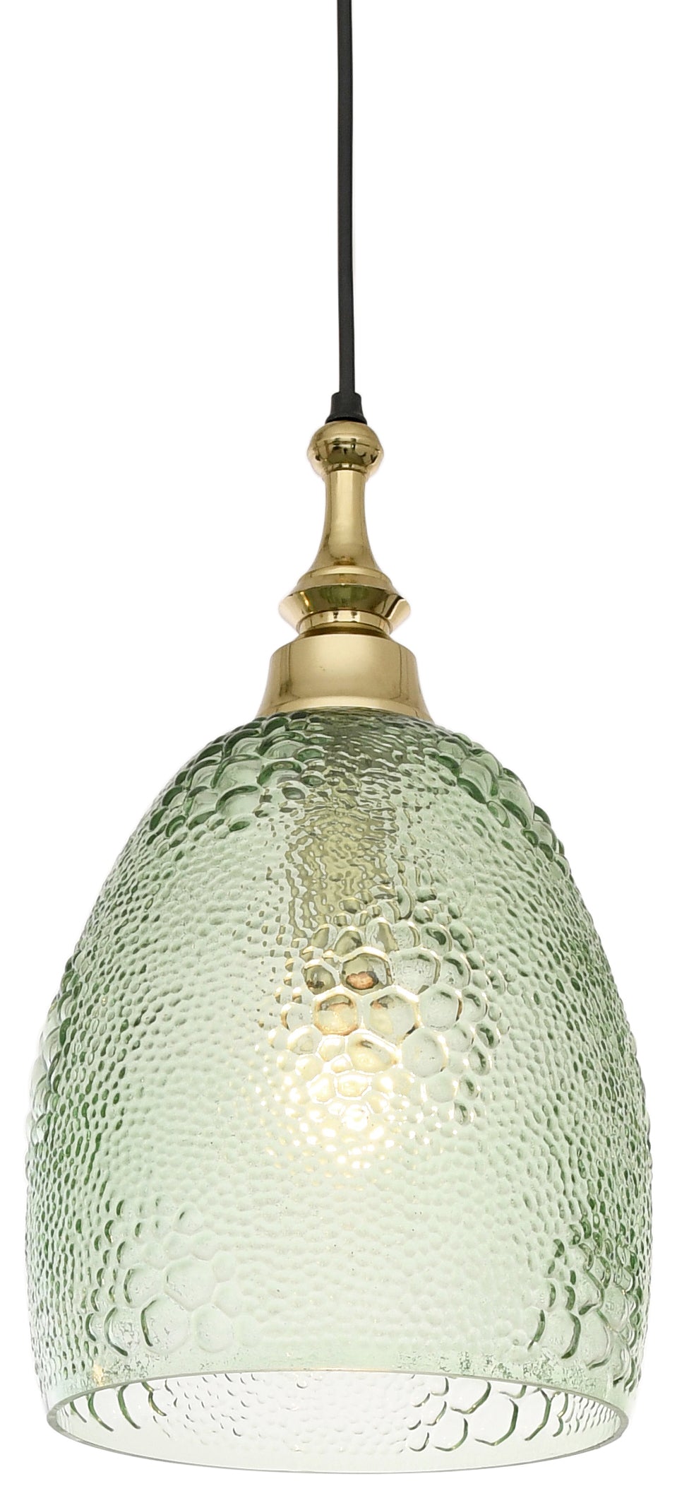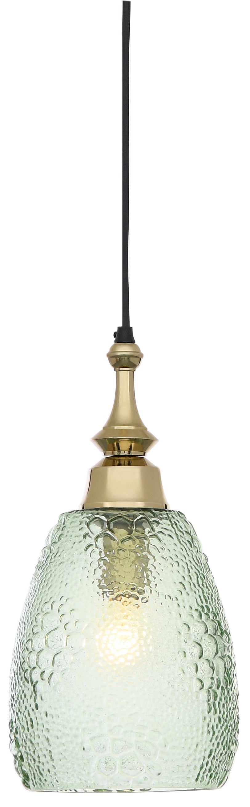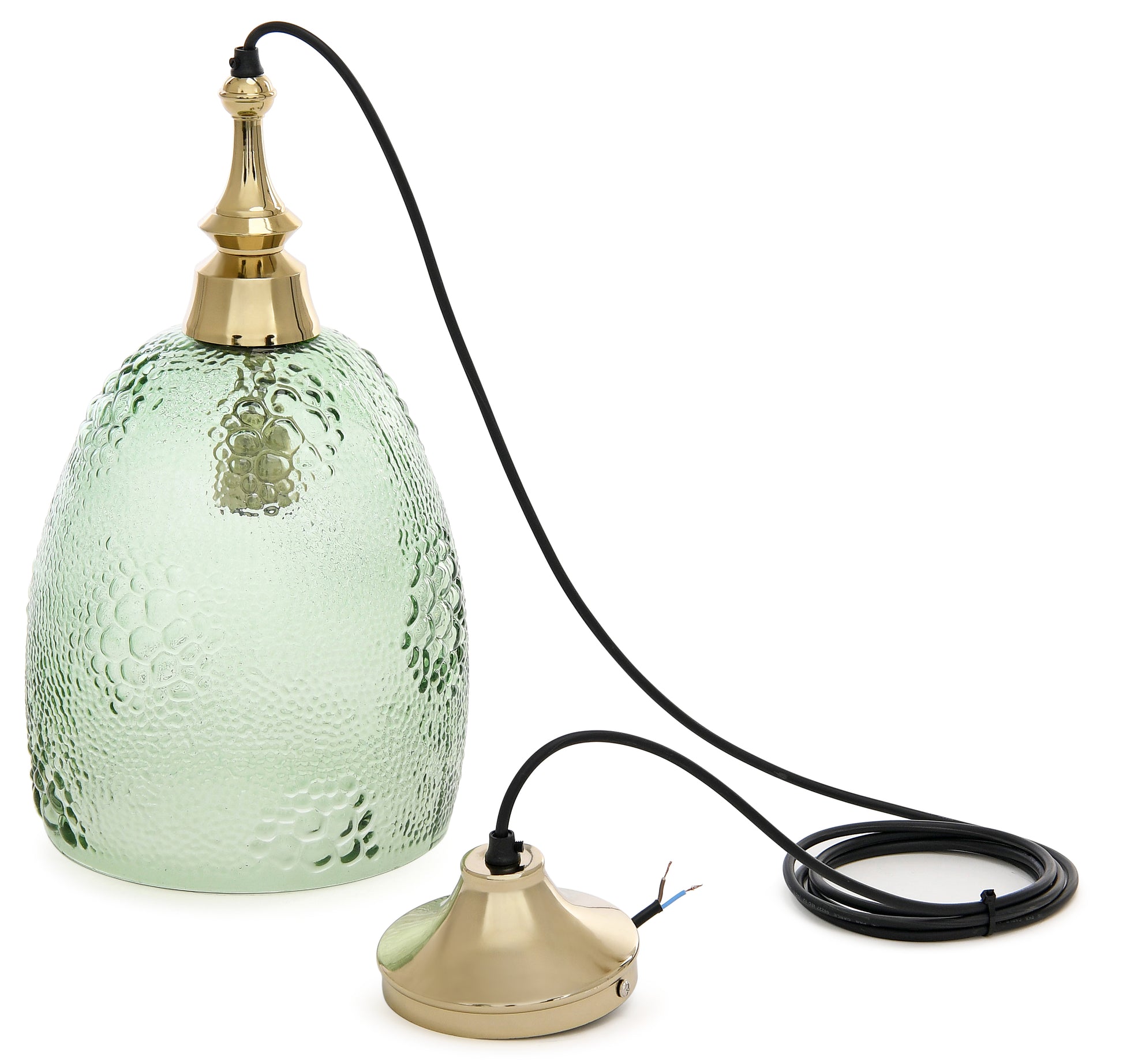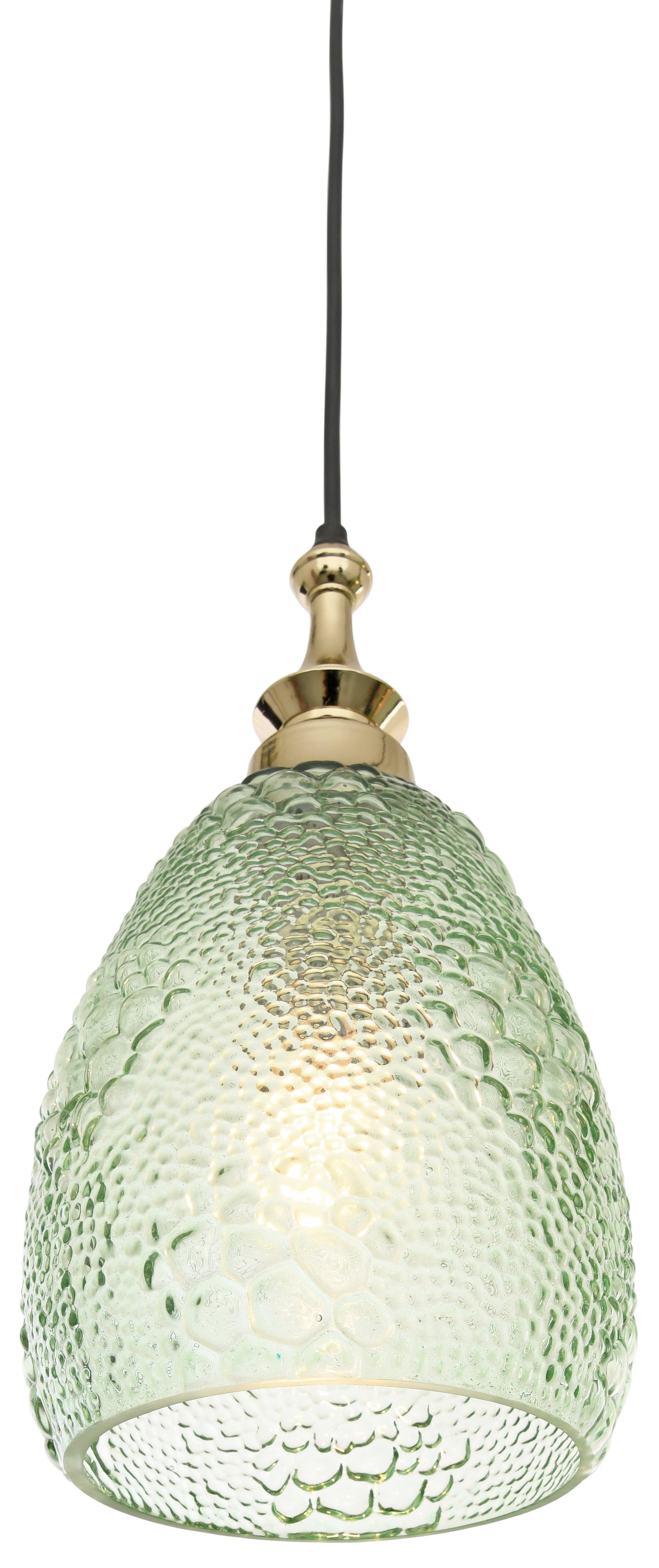 Pendant with green grapes motif glass. The upper part is cast aluminium. The finish is shiny gold.