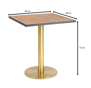 For outdoor using. Table Top in PE wood with aluminium frame. Leg and foot in Powder coated aluminum. Table Top PE wood with aluminium frame.
